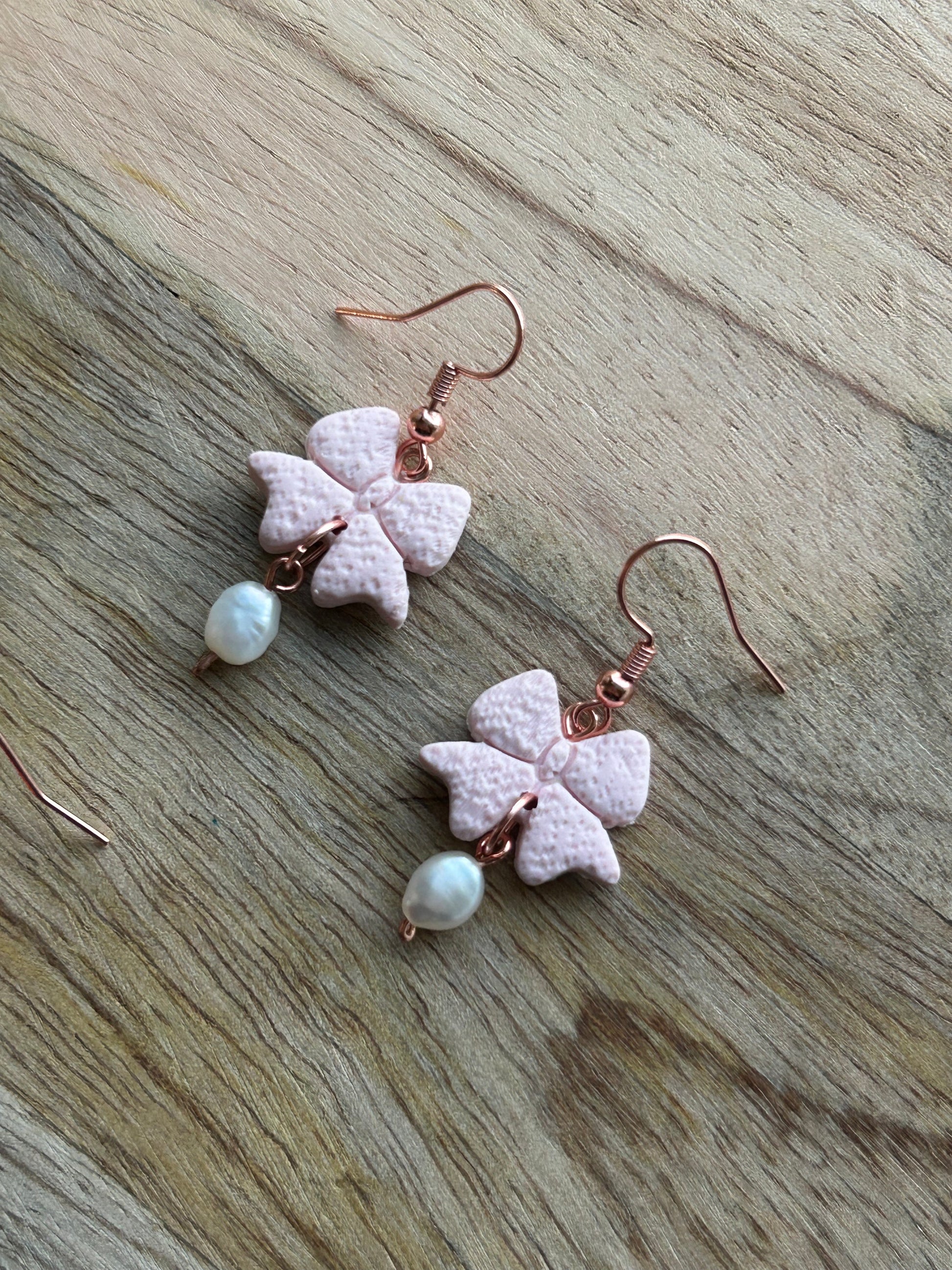 Polymer clay bow earrings. There are only one of each pair but you can choose from a light pink and hot pink. Both pearls used on each pair is fresh water pearls from a bead store near the beach.