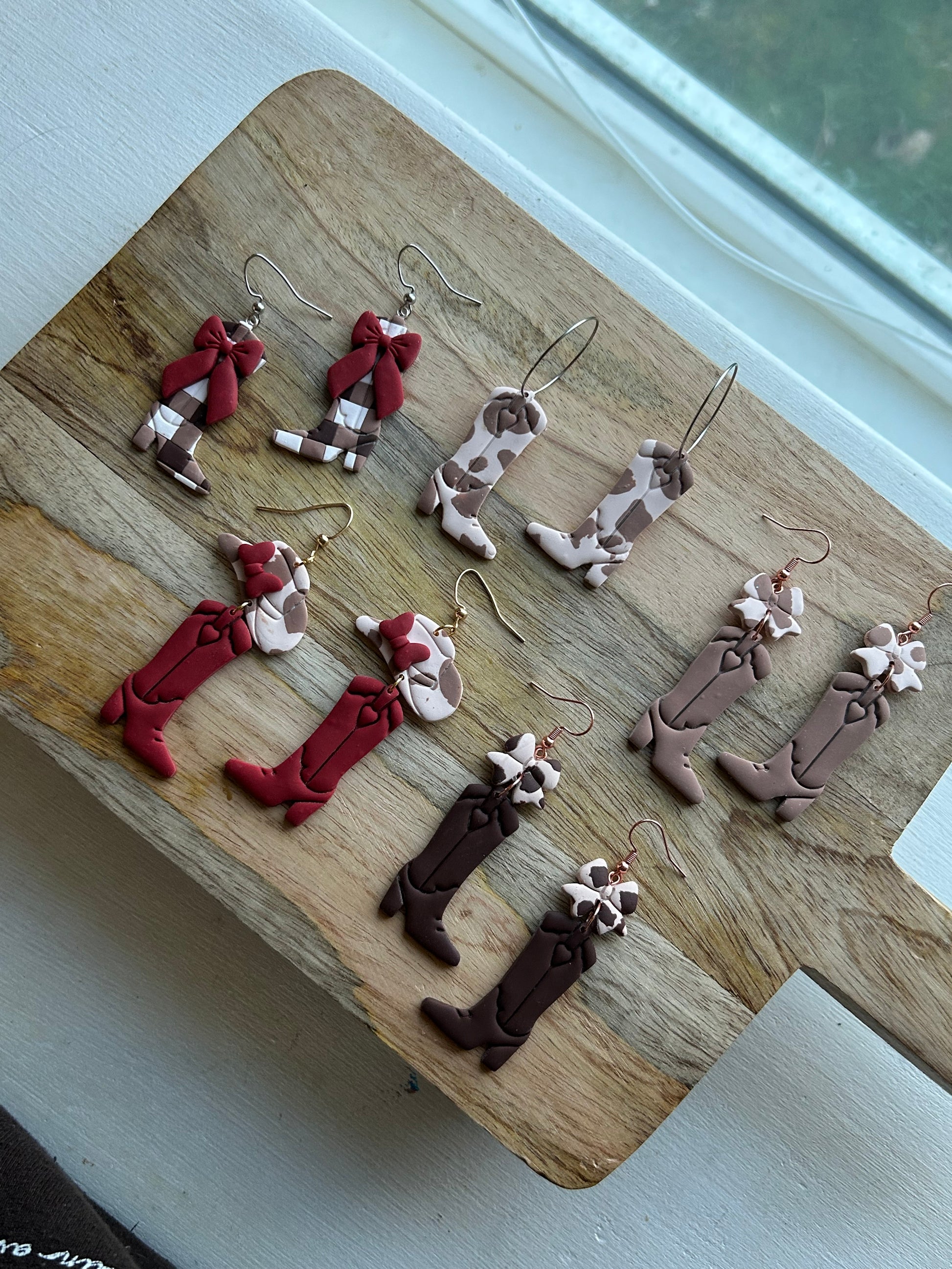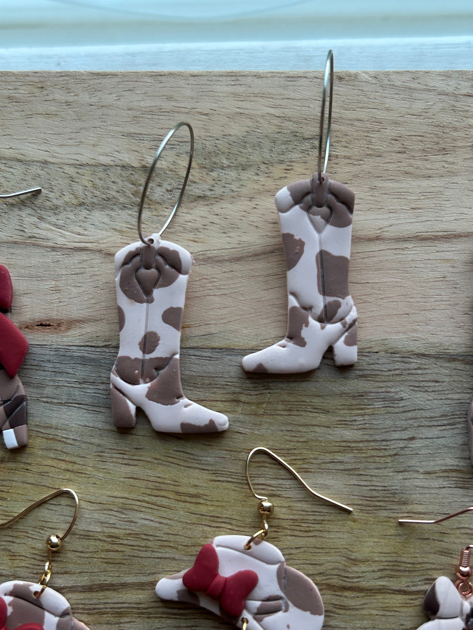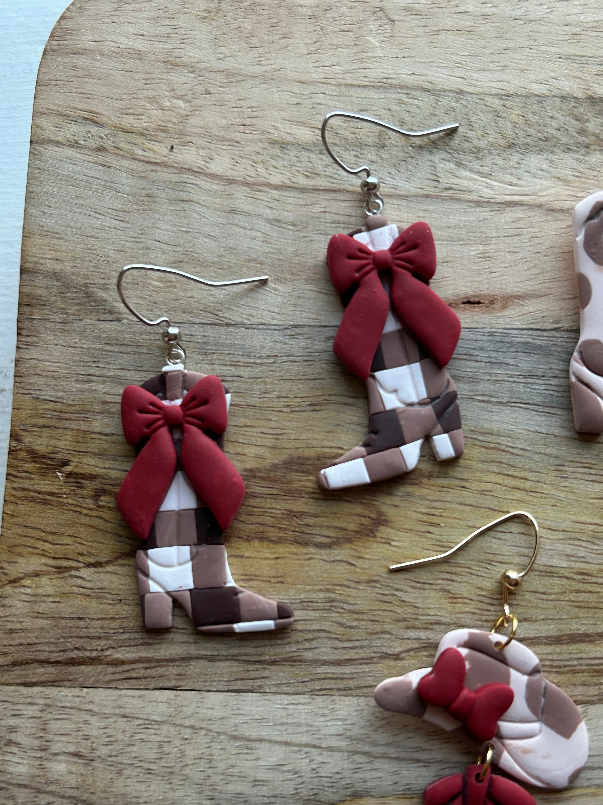 Polymer clay cowgirl boot earrings. There are only one of each of these earrings. You can choose from a light brown, dark brown, light brown cow print, brown gingham, or red.