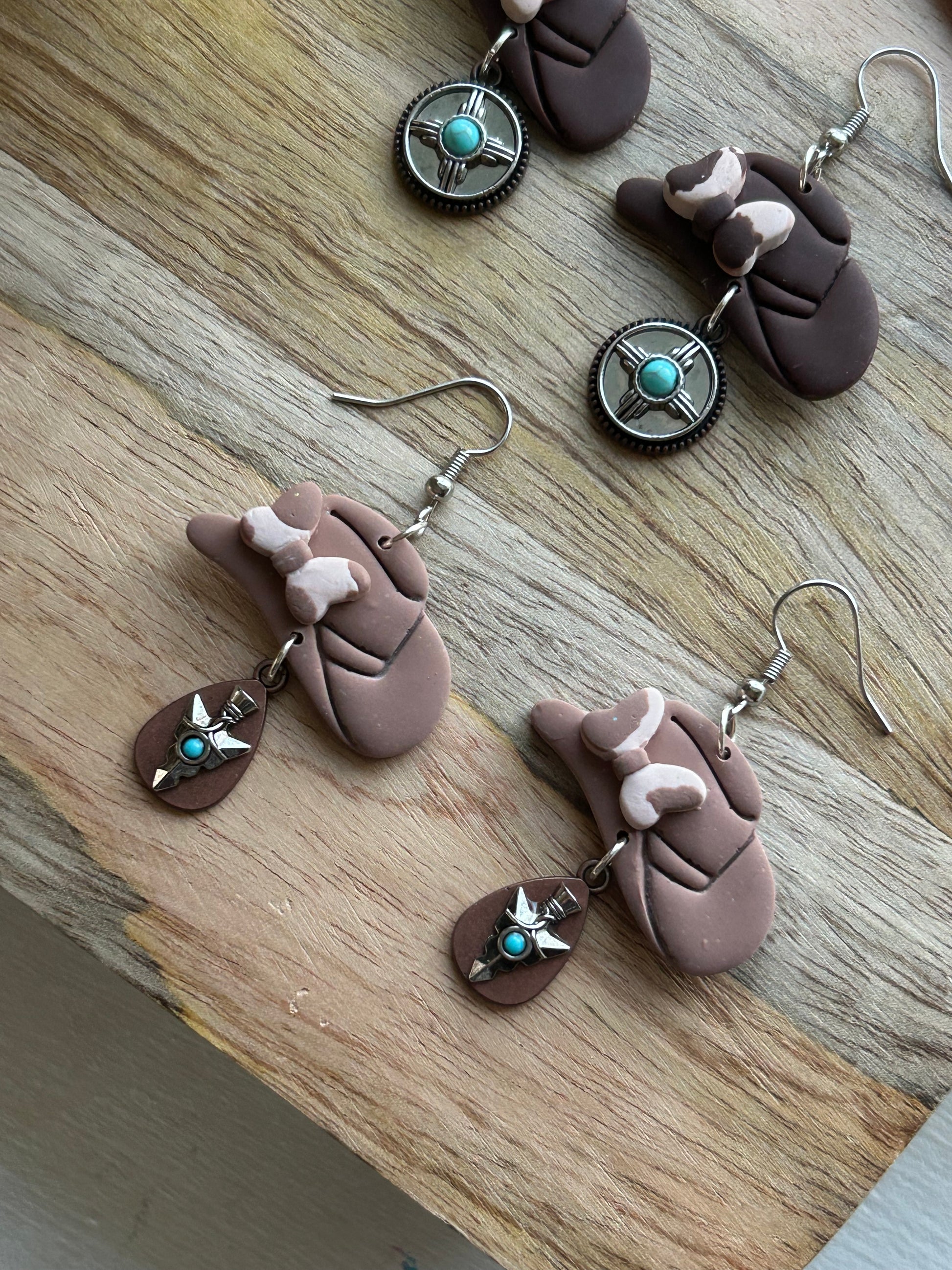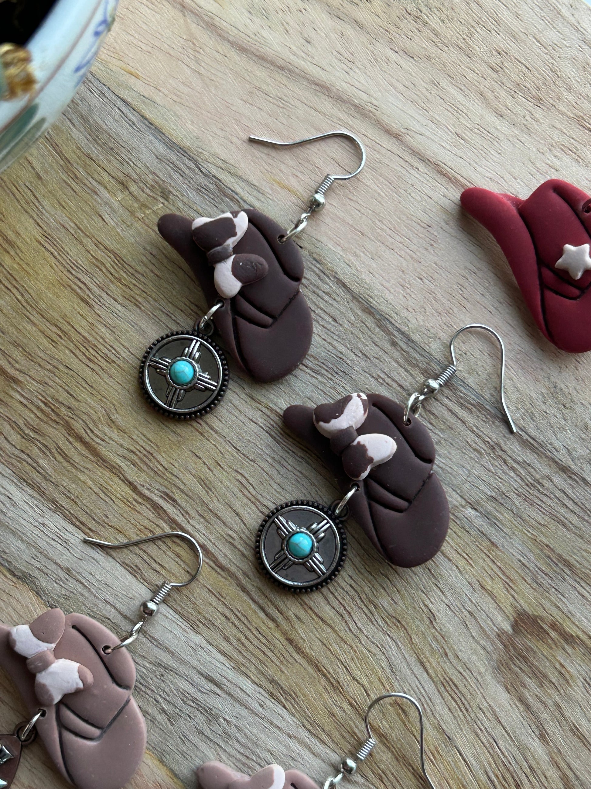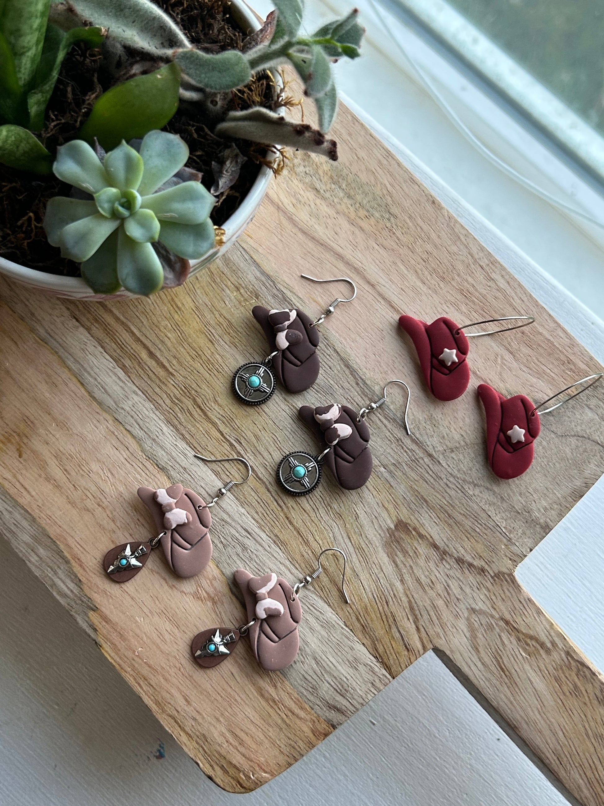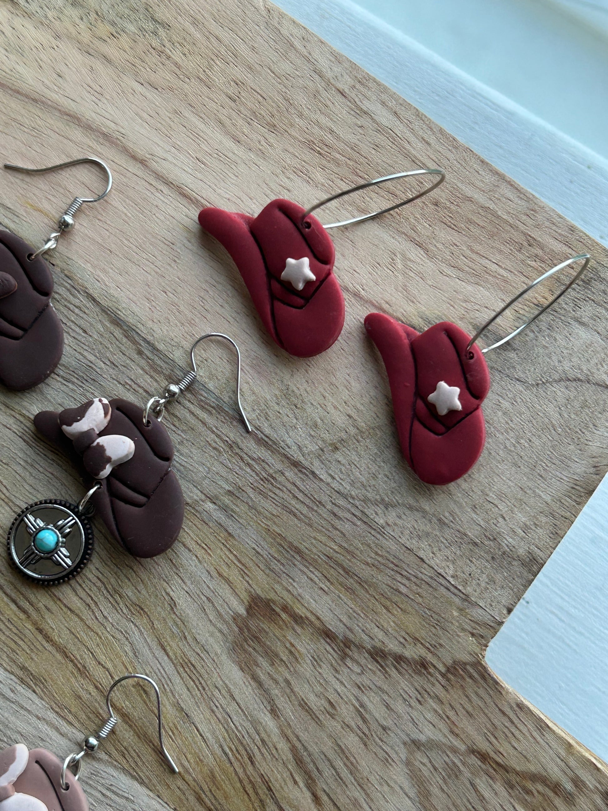 Polymer clay cowboy hat earrings. There are only one pair of each. The colors you can choose from are light brown, dark brown, or red.