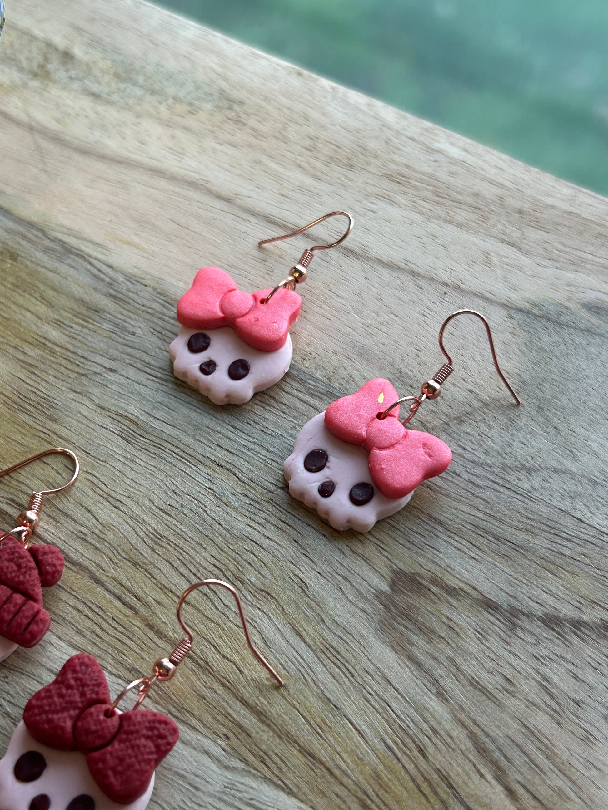 Polymer clay skull heads. There is only one pair of each skull. You can choose skull heads with pink bows or skull heads with a hat and bow.