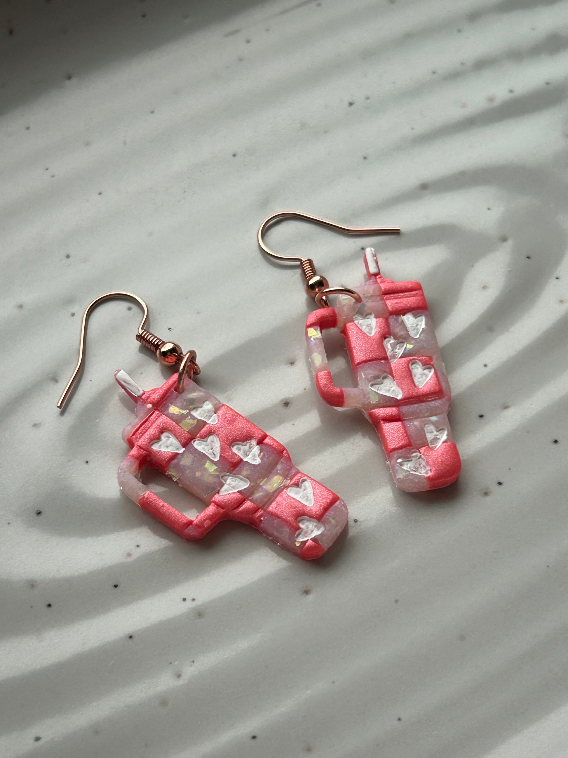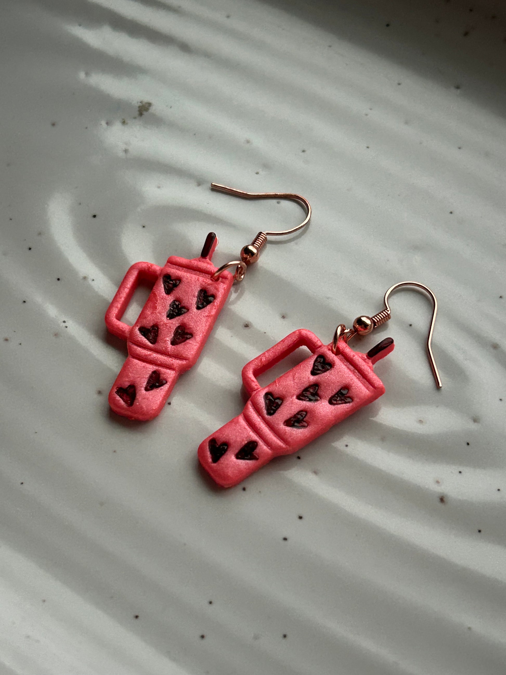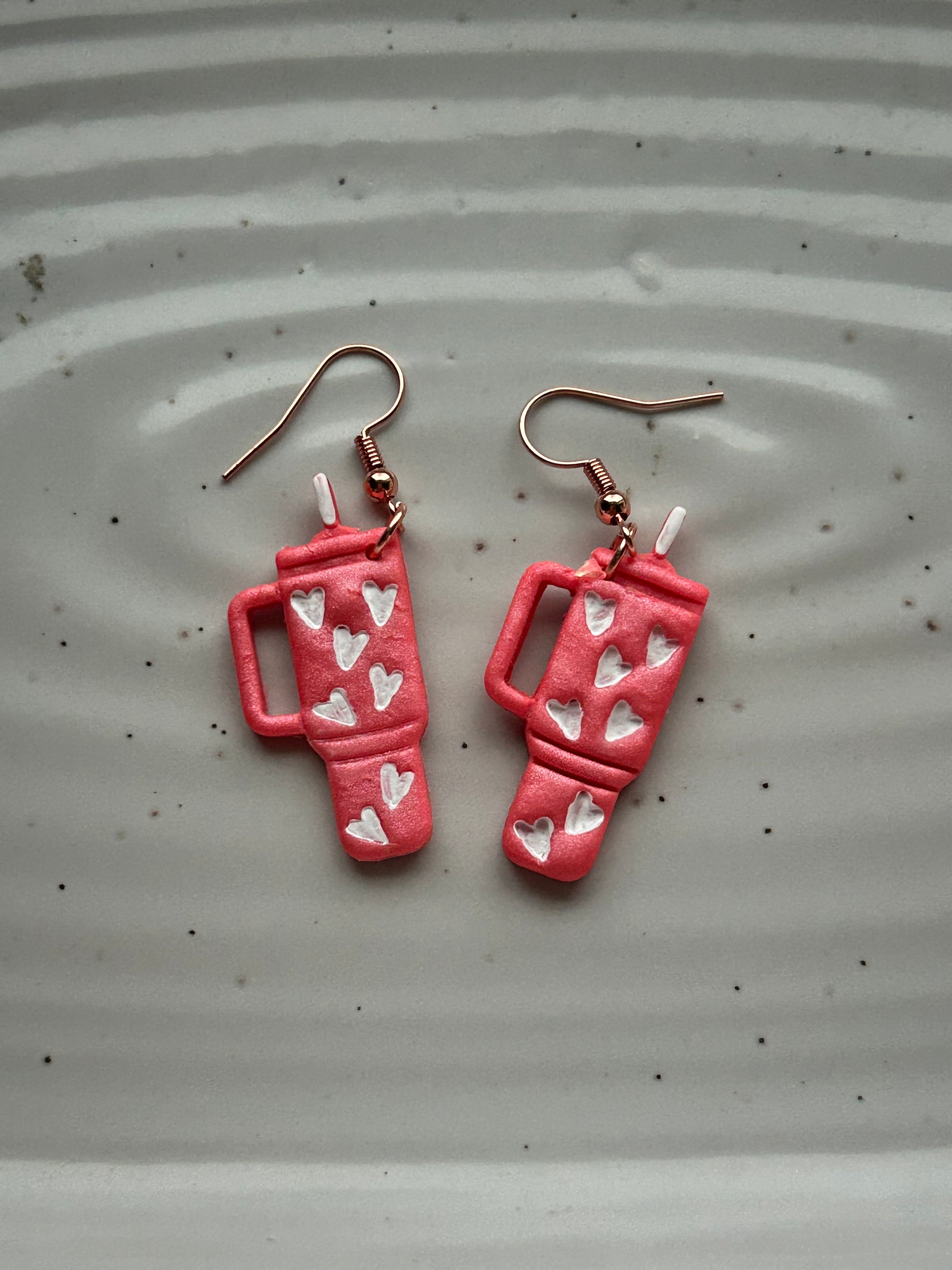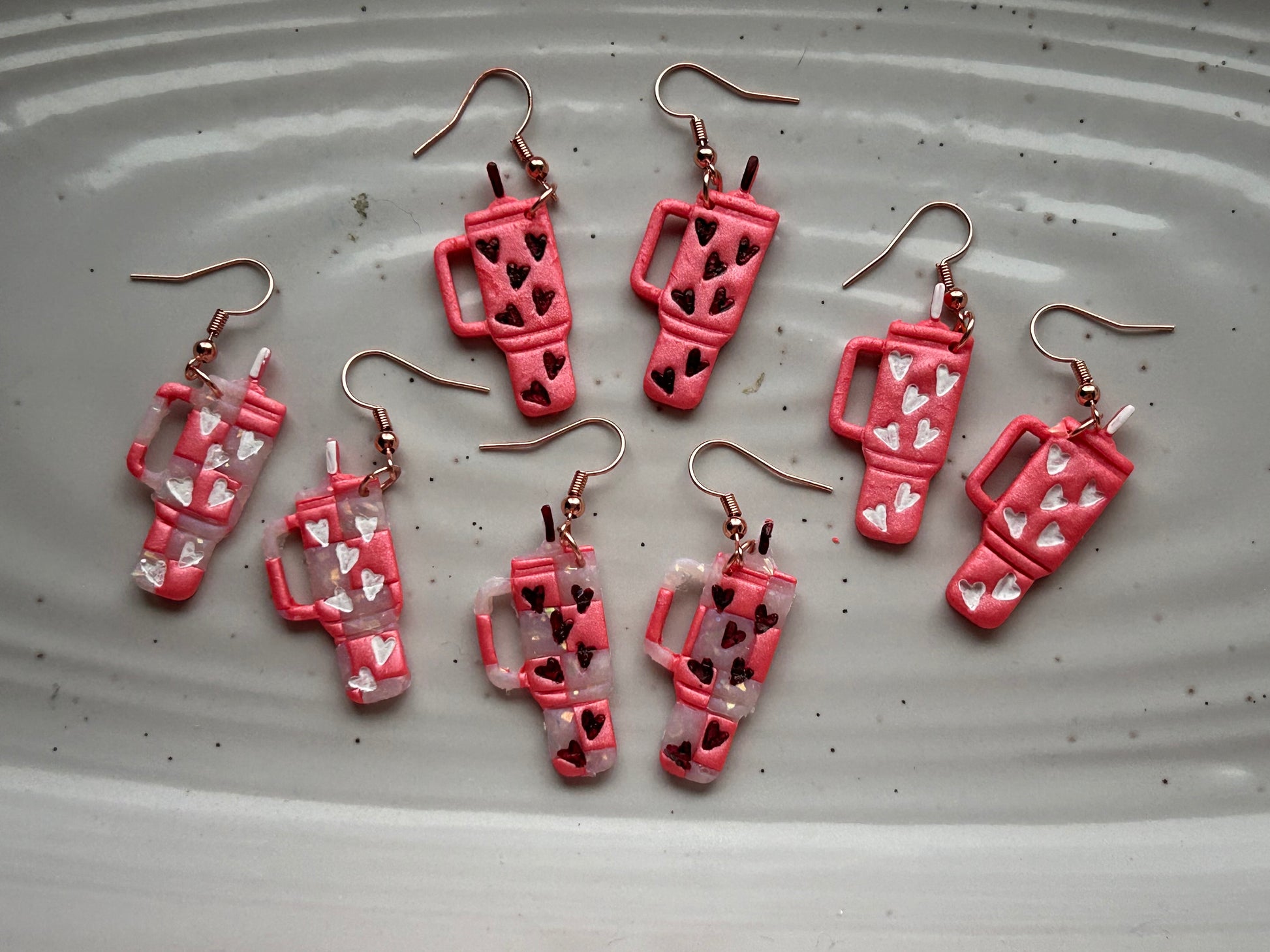 These stanleys are made with clay and were painted with acrylic paint. They also have rose gold fish hooks attached.