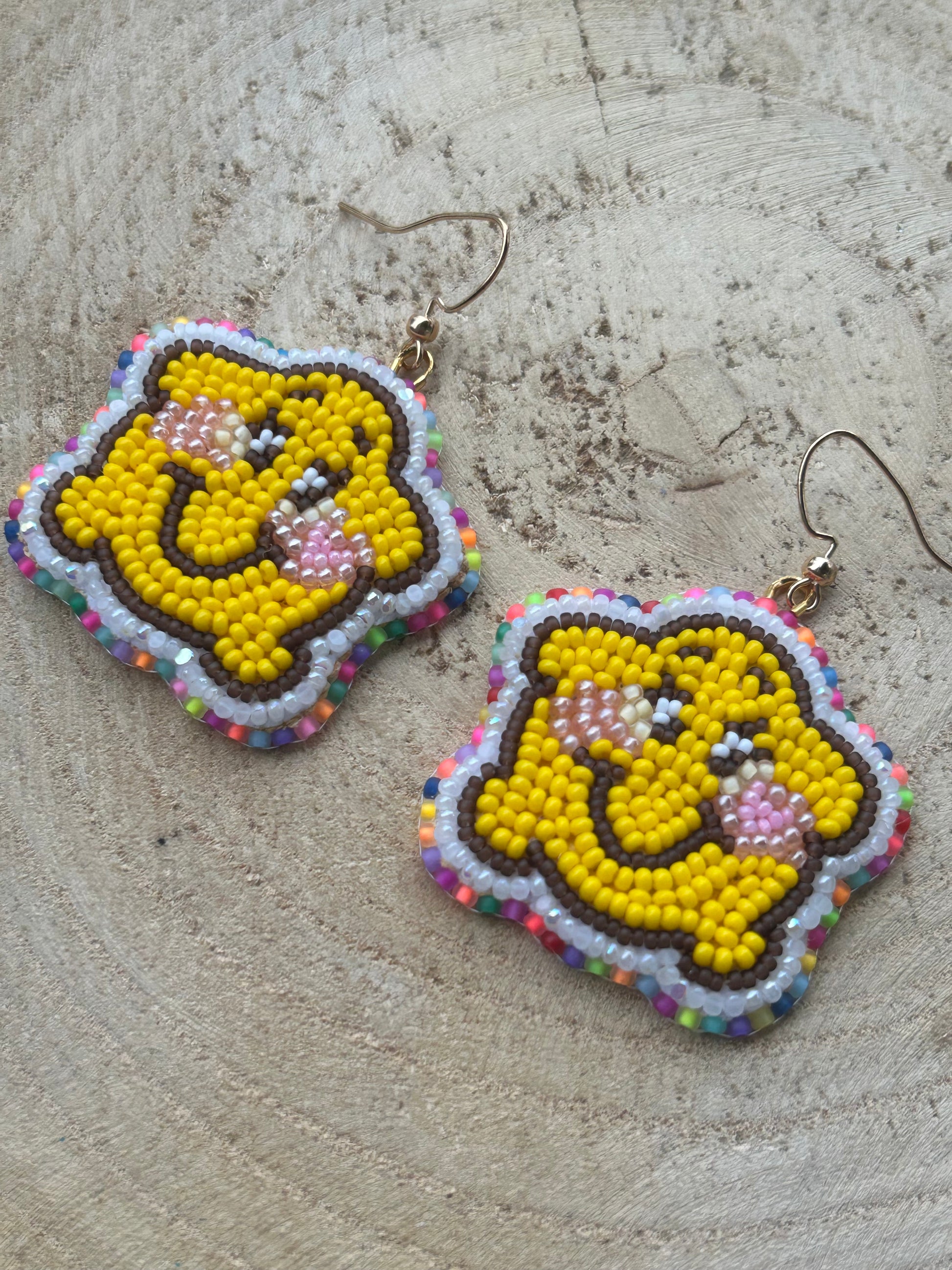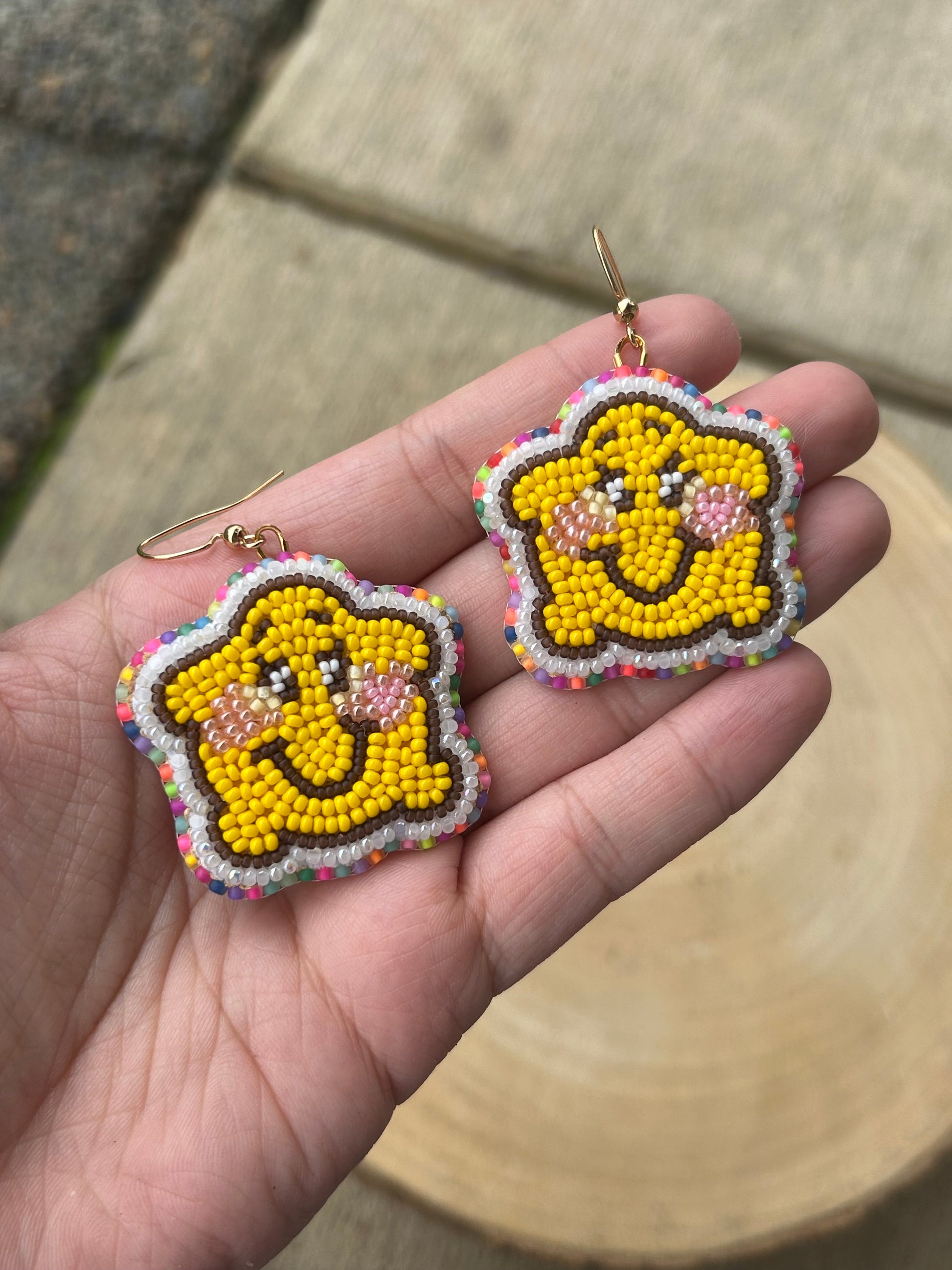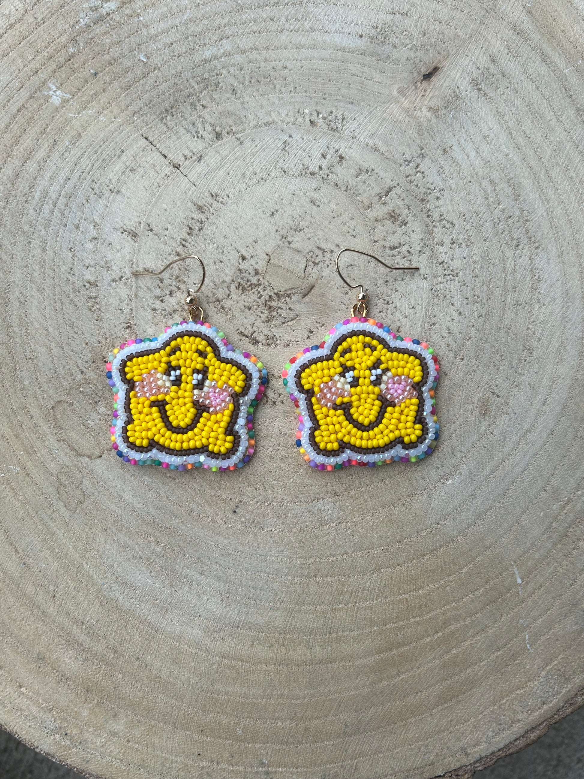 Beaded star made with size 11, 13, and 15 beads. They're backed with smoked deer hide and have gold nickel free hooks.