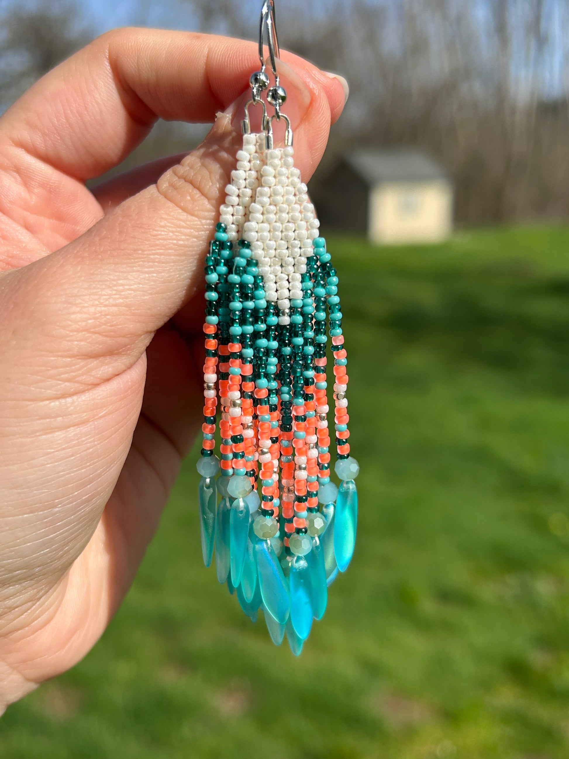 Beaded fringe earrings made with size 11 beads. They also have silver hooks and dagger beads.